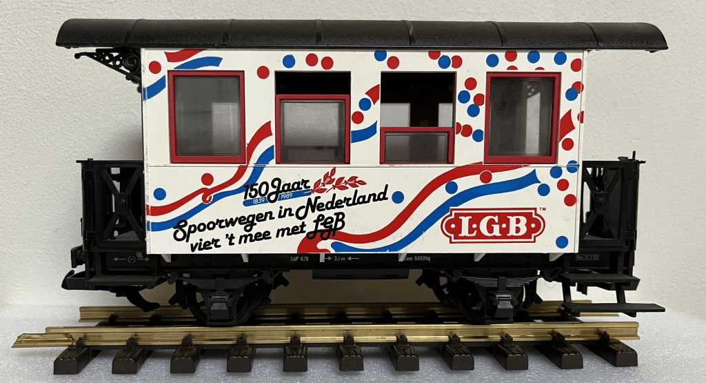 LGB Jubileumzug “150 Jahre Niederländische Eisenbahn”. Lok mit 2 Personenwagen, Trafo, Anschlusskabel und originaler Verpackung.